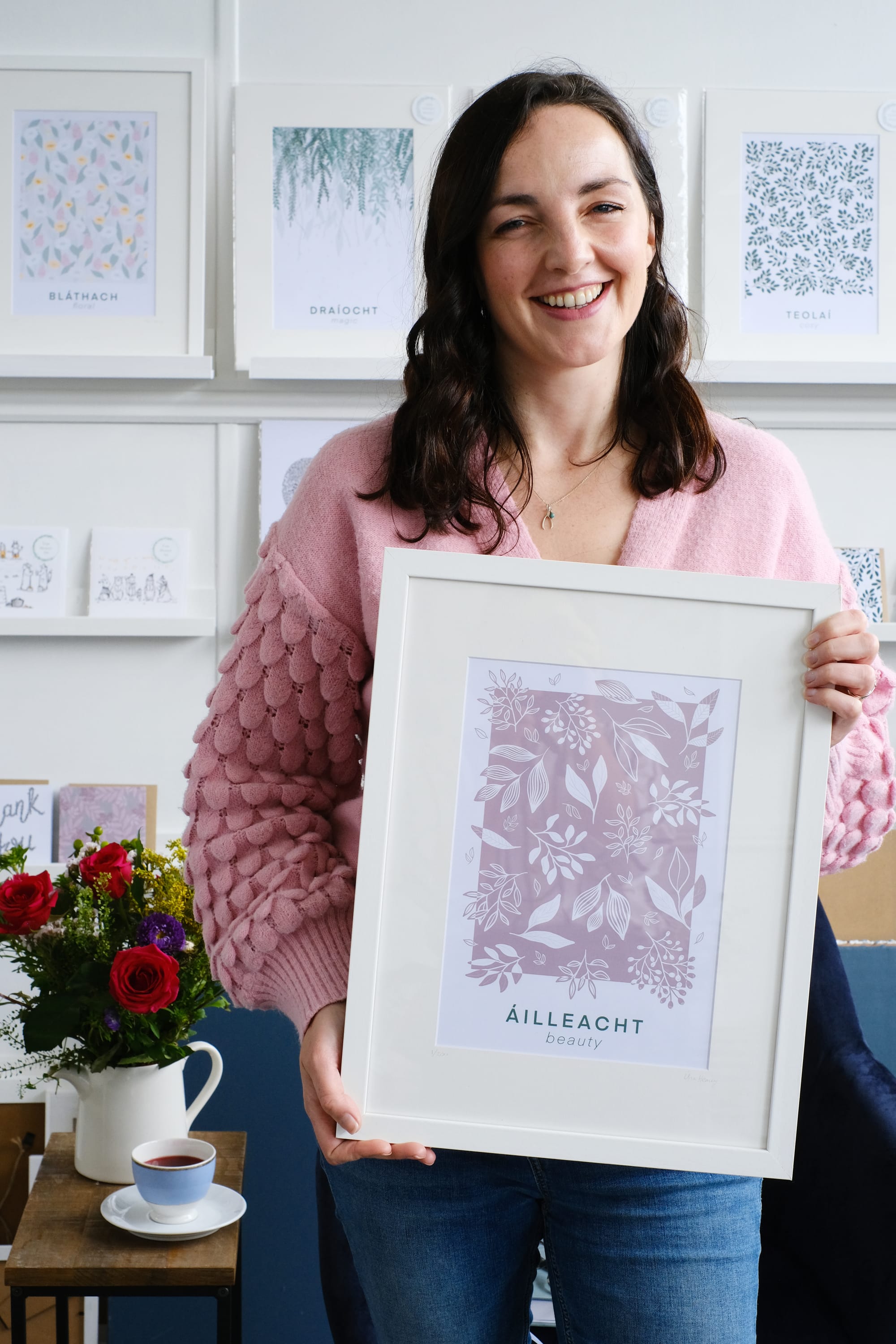 From left: Una Heaney with one of her Prints, Nota Poca Deskpad and Rudaí Olla Tote Bag