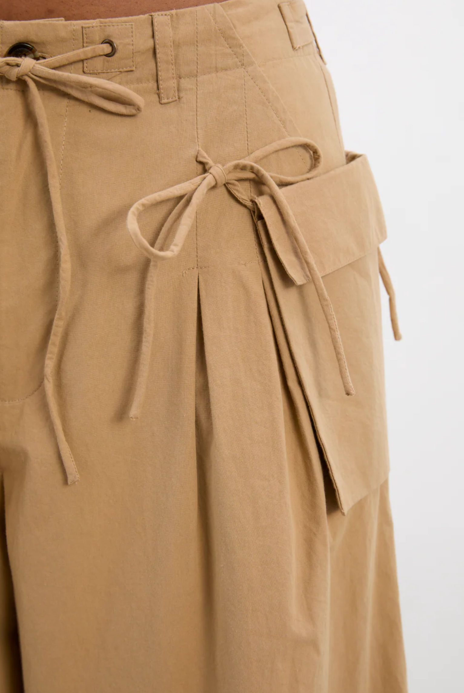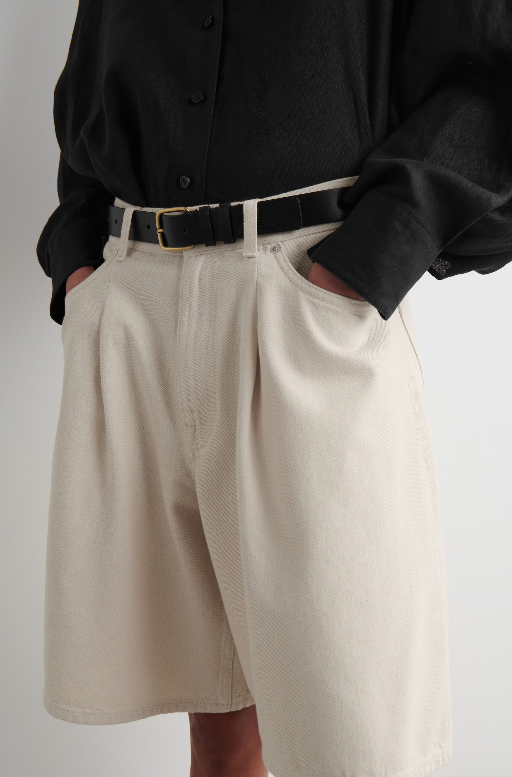 Wide-leg denim shorts, €69, Cos; bubble hem pin-tuck top, €89, Arket; Tatianna culotte in tan, €105, Damson Madder.
