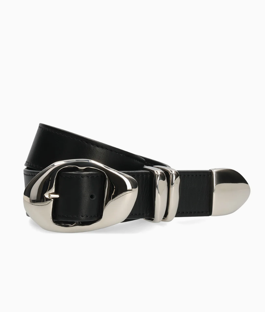 The Grumeti belt, $295, Amanu Studio; wide-brimmed hat, €69, Cos; brown rectangle sunglasses, €120, Maie; black kitten heels, €24.99, H&M; large Joy necklace, €150, Inner Island